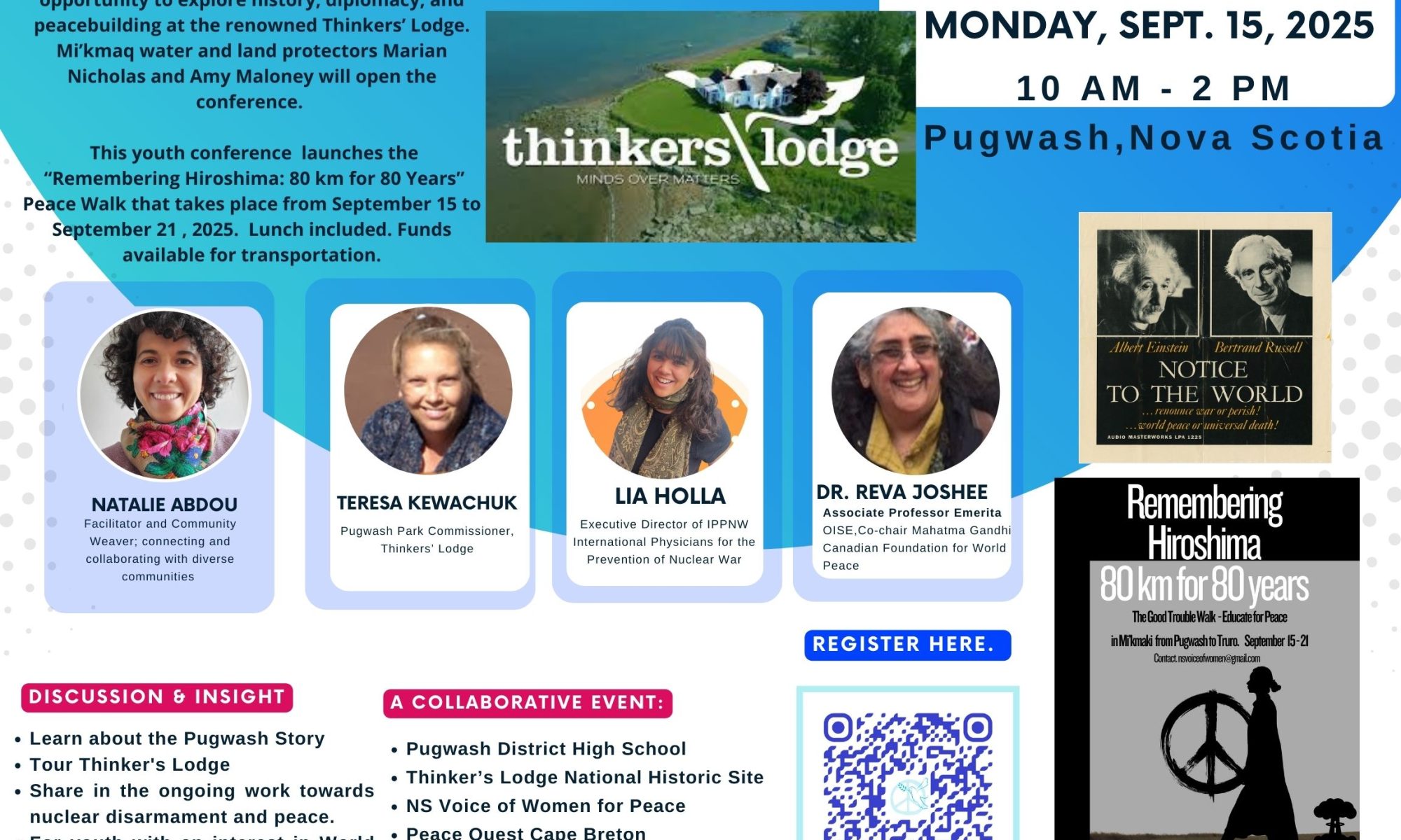 This youth conference launches the peace walk, “Remembering Hiroshima – 80 km for 80 Years”, and we are honoured that Mi’kmaq water protectors will open the events with a water ceremony and recognition of all we need to protect together for a sustainable future.